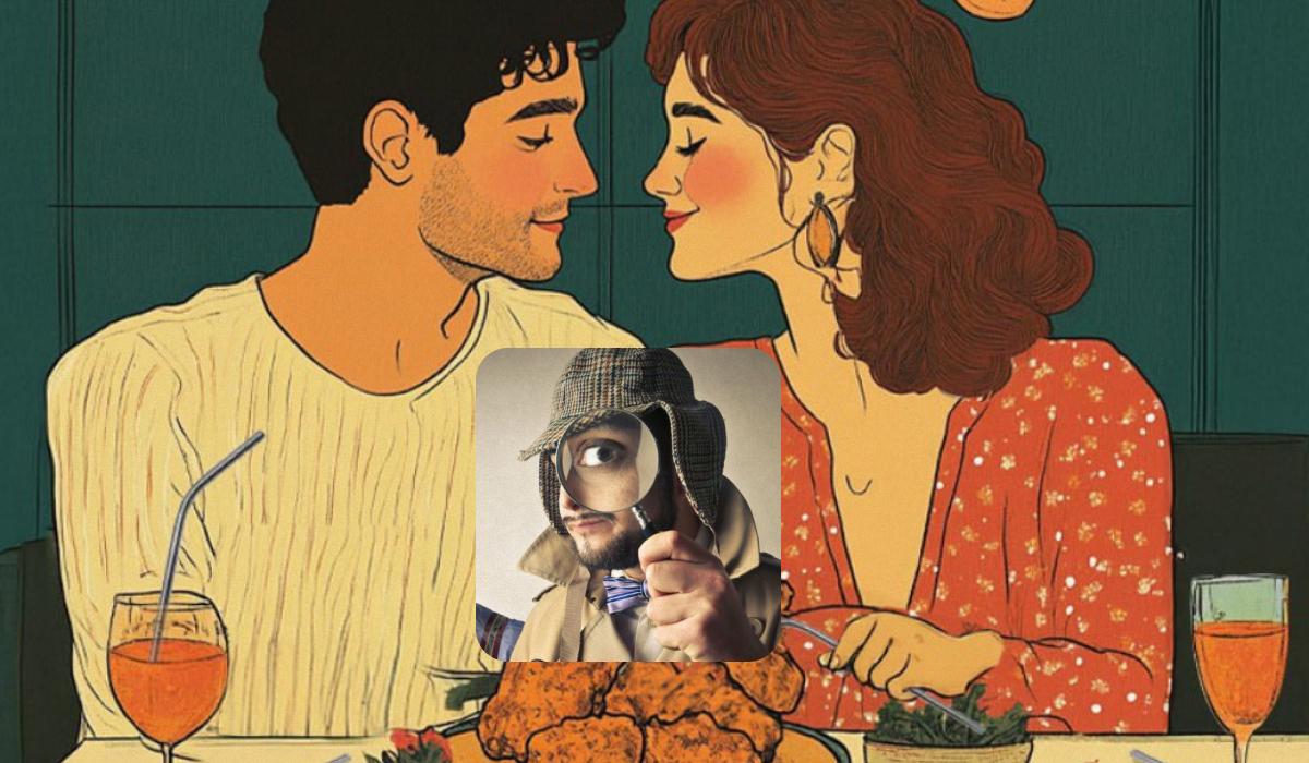 Davanti a voi ci sono un uomo e una donna innamorati, che chiacchierano piacevolmente durante una cena romantica. La ragazza è vestita con un abito elegante e l’uomo con un maglione leggero. Sul tavolo ci sono bicchieri con bevande e diversi piatti gustosi. Alle pareti del locale sono appesi dei qri e dal soffitto pendono delle lampadine.