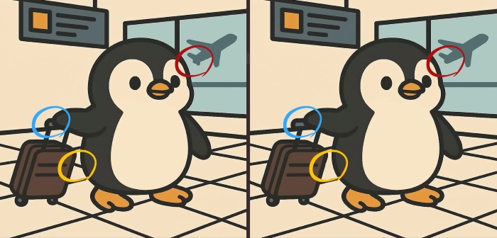 Test del QI: trovare 3 differenze in un’immagine di un pinguino in un aeroporto in 61 secondi