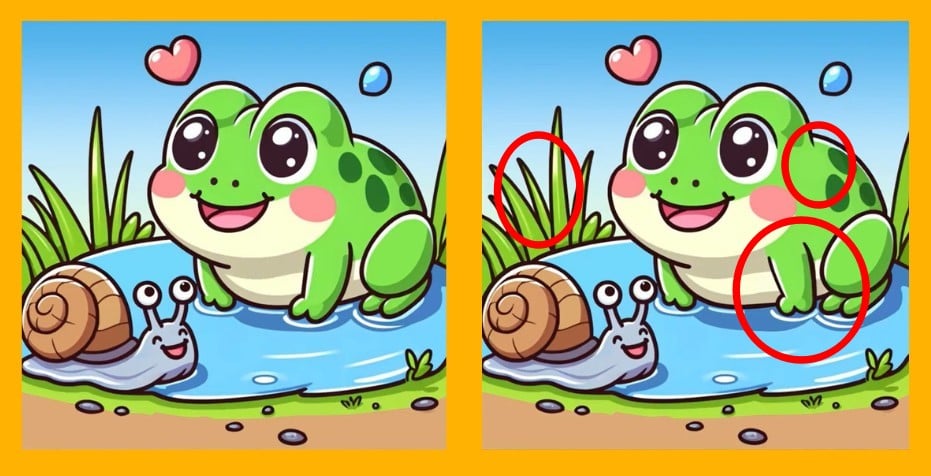 Allora, siete pronti per la prossima sfida? Osservate attentamente due immagini di una rana e di una lumaca. A prima vista possono sembrare ugi, ma ci sono 3 piccole differenze. Pensate di riuscire a trovarle tutte in 17 secondi? Provate e mettete alla prova la vostra acutezza visiva!